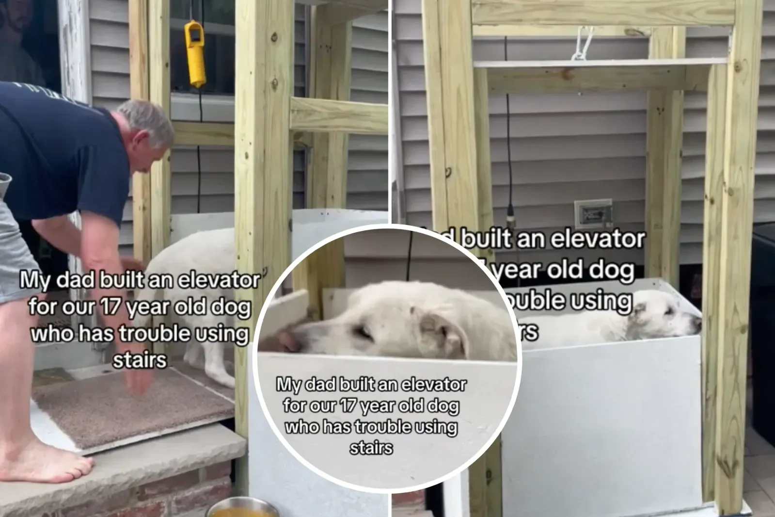 Diante dessa limitação, o pai da tutora decidiu facilitar a rotina do animal. O elevador caseiro foi construído de forma artesanal e adaptado à estrutura da casa, permitindo que Sadie se locomova com segurança entre os diferentes níveis da residência com menos esforço físico.